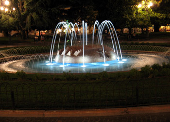 Couleurs nocturnes de la fontaine au milieu de la place
