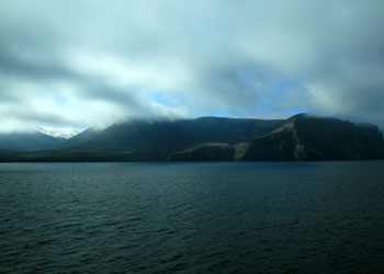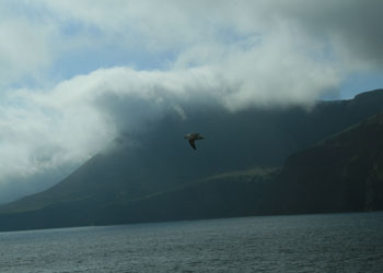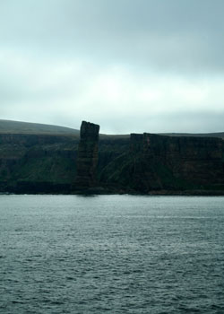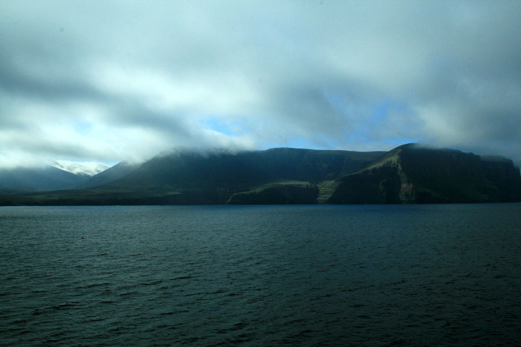 Après près plus d'une heure de traversée, la première île (Hoy) est en vue. Elle perce à peine au milieu des nuages,