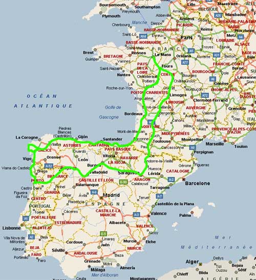engloutir près de 4000km en à peine une semaine ! Pour un premier voyage dans le Sud de l'Europe, j'en prend plein les yeux avec les côtes superbes du Pays-Basque, Saint Jacques de Compostelle et la Galice ou la "Bretagne espagnole" et même un détours dépaysant et improvisé par le Portugal. Un apercu de l'Espagne qui donne envie d'en parcourir encore plus... Première étape, traverser la France du Nord au Sud, rien de passionnant,surtout que je fais la plus gande partie du trajet sous la pluie et le vent. Mais dès que je passe la frontière espagnole cela s'arrange. Cela me permet de découvrir San Sebastian avec ces très belles baies, sa cote rocheuse et sa vieille ville très animée. Pour la seconde journée, direction la Galice avec la traversé du Pays-Basque en longeant la magnifique côte jusqu'a Bilbao, mais la partie entre et n'est pas en reste. J'arrive en fin de journée à Santiago de Compostella, après une longue route. Troisème jour, journée plus calme avec rpos le matin et visite de Santiago, la basilique et la vieille ville, puis l'après-midi la découverte de la cöte granitique de la Galice et la cap Fisterra. Le quatrième jour ce sera un passage par le Portugal tout proche, toujours en longeant cette superbe côte, jusqu'à Porto. Puis je m'enfonce dans les montagnes à l'intérieur du Portugal en suivant le Douros jusqu'à Villa Real, l'étape du soir. Le cinquième jour est consacré à traverser une bonne partie de l'Espagne, à travers de la Castille & Leon et ses paysages parfois desertiques, pour me mener à Zaragose. Le lendemain la route me mène à travers les Pyrénnées Espagnols et les cols qui débouchent sur la France où je continue ma route jusqu'à Perrigeux. Enfin le dernier jour est occupé à parcourir le dernier ruban de route pour rejoindre Le Mans. |