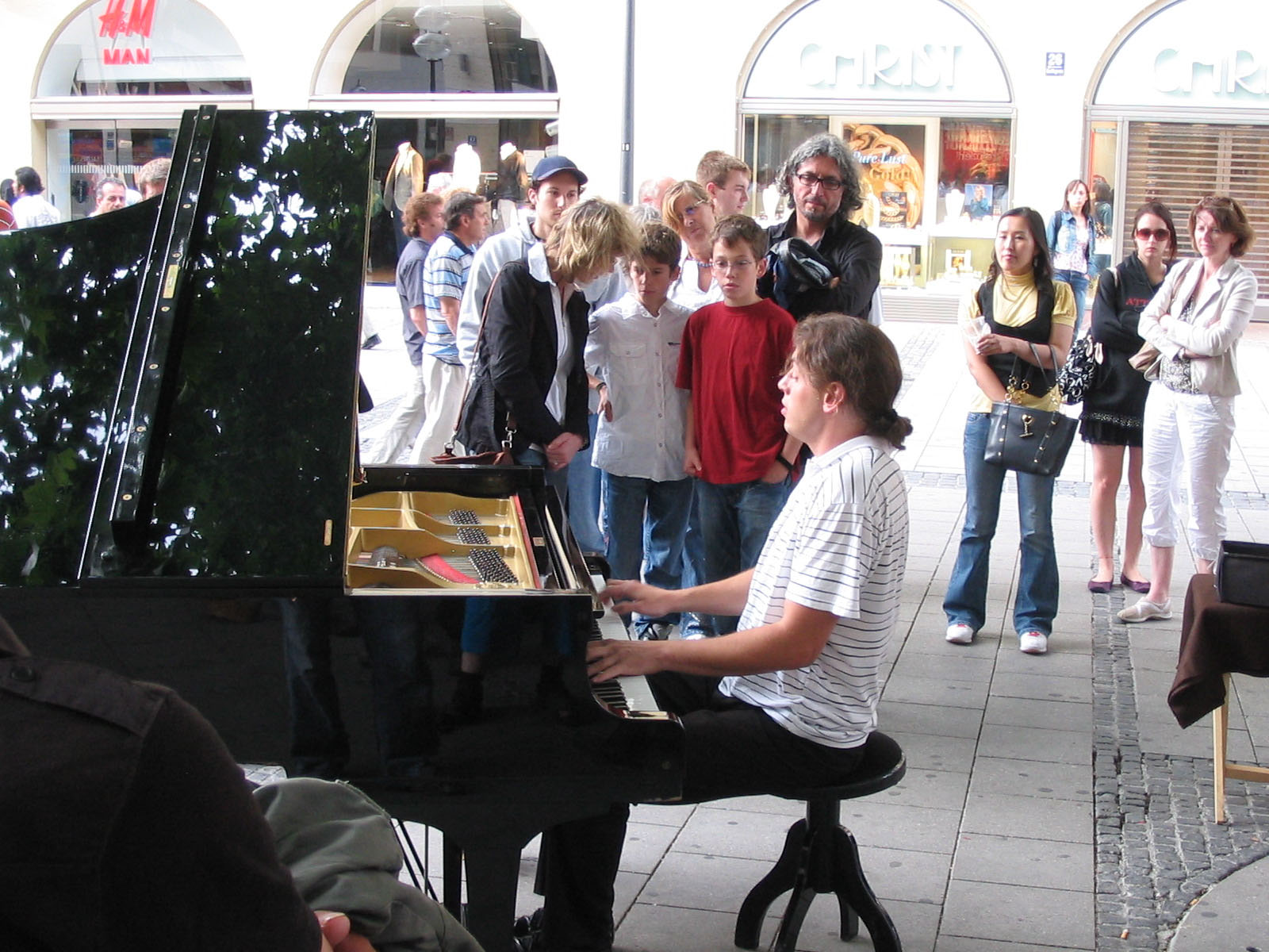 A l'autre bout un pianiste joue du Mozart. Tout le contraste de la société allemande en une rue.