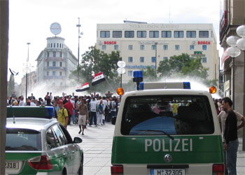 d'artistes de rue. A l'une des extrémités, la communauté Irakienne fête la victoire d'une équipe de foot, une manifestation très encadrée par la police.