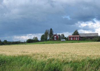 Images typique de la campagne suédoise : Le jaune des champs de blé, le rouge des