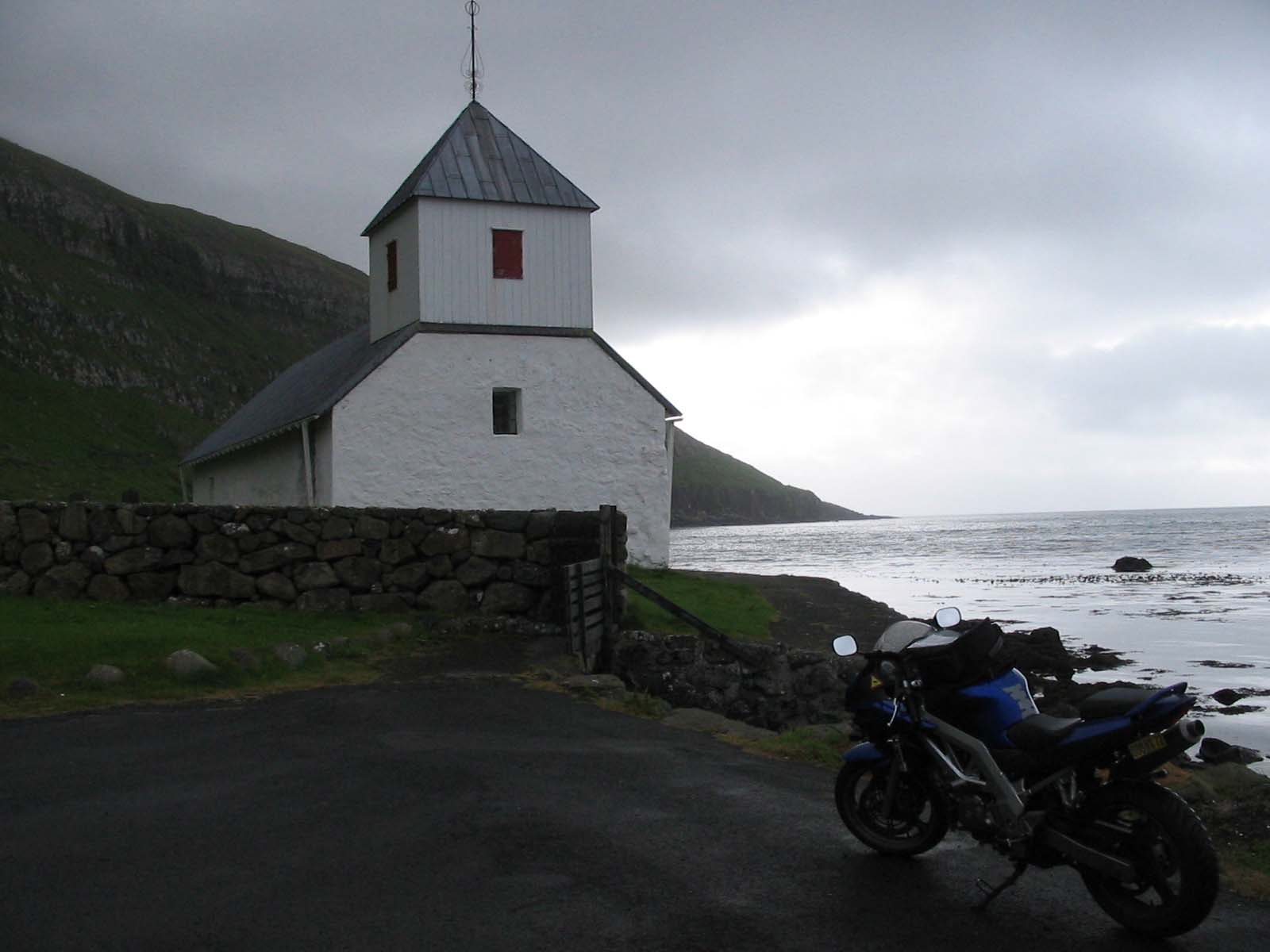 Le SV devant la petite chapelle du village de Kirkjubour.