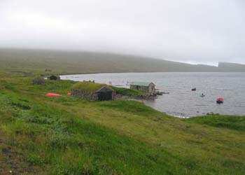 Quelques baraques de pêcheurs en pierre au bord d'un lac sur l'île de Vagar.