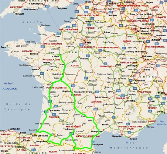 Quatrième jour, poursuite de la traversée avec toujours d'innombrables virolos et paysages. Malheureusement certains cols comme le mythique Tourmalet et l'Aubisque seront fermés, car non encore praticables, ce qui m'obligera à faire de grands détours. Le soir c'est finalement l'arrivée au bord de l'océan Atlantique, dans le Pays-Basque, à Biarritz. Enfin, le cinquième jour n'a rien de bien passionnant, il s'agit du retour, retraversée de la France du sud au nord via autouroute. Le programme |