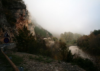 les gorges du Tarn dans cette atmopshère irréelle. Le soleil ne tarde pas à percer, le jeux de lumière deveint magique : Entre